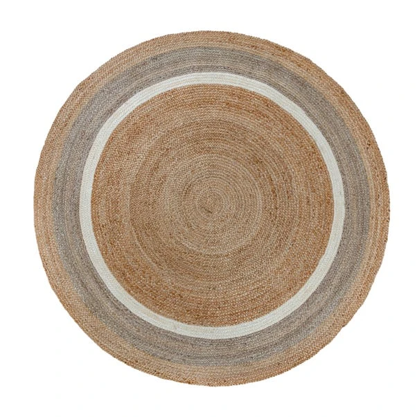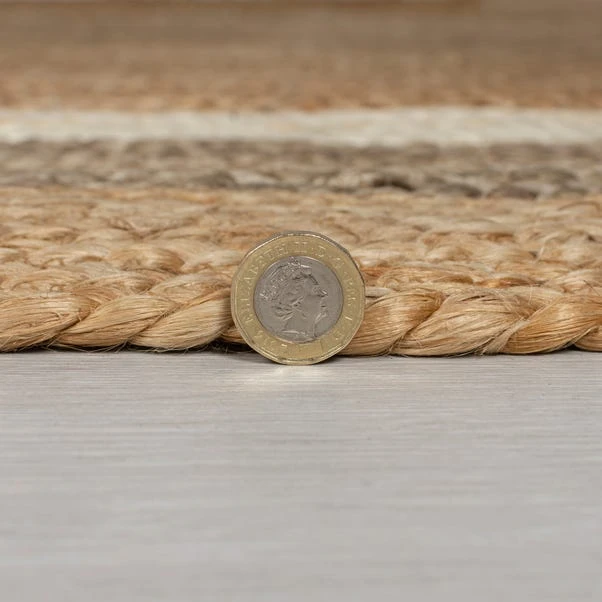 Crafted from 100% hardwearing jute with a woven pattern, this circular rug features a natural colour with a white stripe pattern.